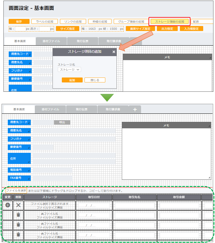 ※ストレージ項目の追加から選択する「ストレージ名」は、[台帳設計]メニューの「項目設定」で設定している項目名称になります。