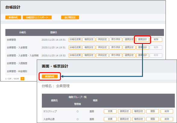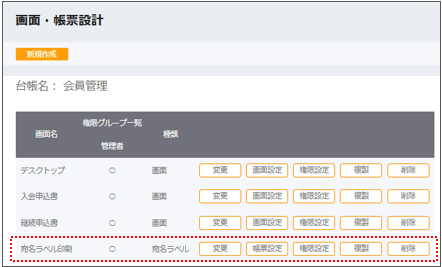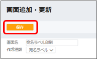 ③ 画面名を入力し、作成種類を「宛名ラベル」に設定して「保存」をクリックすると、「画面・帳票設計」の一覧に反映されます。