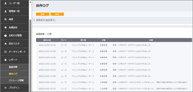操作ログの削除は、管理者サイトかつ管理者権限を持つログインユーザーのみ操作可能です。