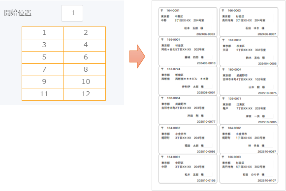 <開始位置「1」を指定した場合の宛名ラベル印字例>