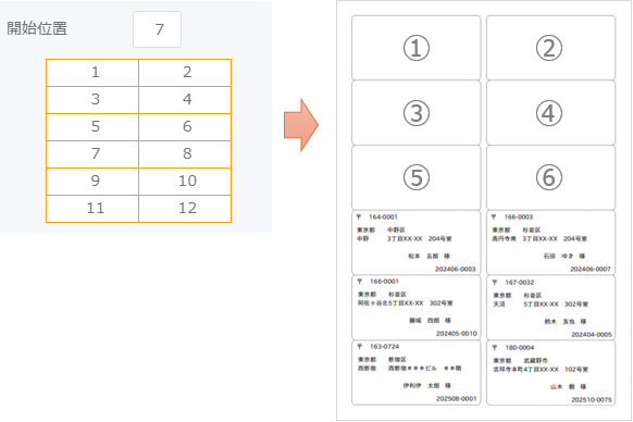 <開始位置「7」を指定した場合の宛名ラベル印字例>