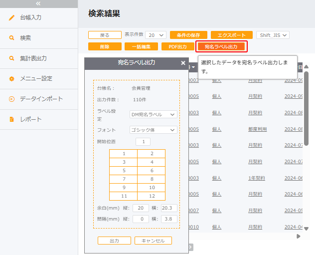 ※出力形式は「PDF形式」で、出力ファイル名は「台帳名_ラベル名_yyyymmdd_hhmmss.pdf」となります。